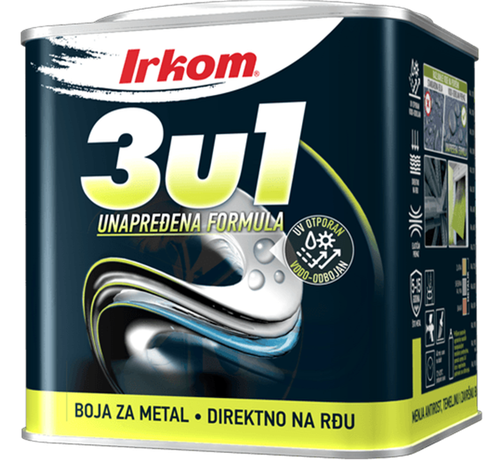 Irkom 3u1 je unapređena formula brzosušive boje koja menja antikorozivno sredstvo, temeljnu i završnu boju. Nanosi se direktno na koroziju i sprecava dalji razvoj iste. 3u1 je boja sa pojacanim dejstvom vodoodbojnosti koje produžava vek trajanja premaza i UV stabilizatorima koji onemogucavaju promenu nijanse pri izloženosti suncevim zracima. Karakteriše je izuzetna tvrdoca, elasticnost, adhezija, otpornost na udar i zaštita od atmosferskih uticaja. Prednosti ovog premaza su zaštita metalnih površina od 5 do 15 godina, posao se završava u jednom danu, pravi se uštedu u materijalu, premaz je otporan na sve atmosferske uslove, ima veliku pokrivnu moc, elastican je i ne puca.
