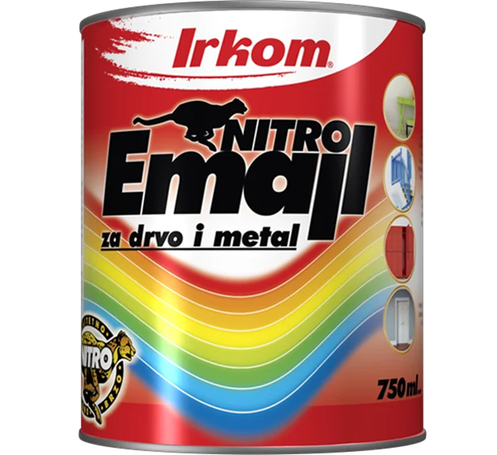 Irkom Nitro emajl lak je univerzalni završni premaz za dekoraciju i zaštitu metalnih i drvenih površina u enterijeru i površina koje nisu direktno izložene atmosferskim uticajima u eksterijeru. Odlikuje se brzim sušenjem. Proizvod je na bazi nitroceluloze, smola i odabranih pigmenata. Koristi se u metalnoj i drvnoj industriji kao i u širokoj potrošnji. Nitro emajl nije preporučljivo nanositi preko uljane temeljne (osnovne) boje.