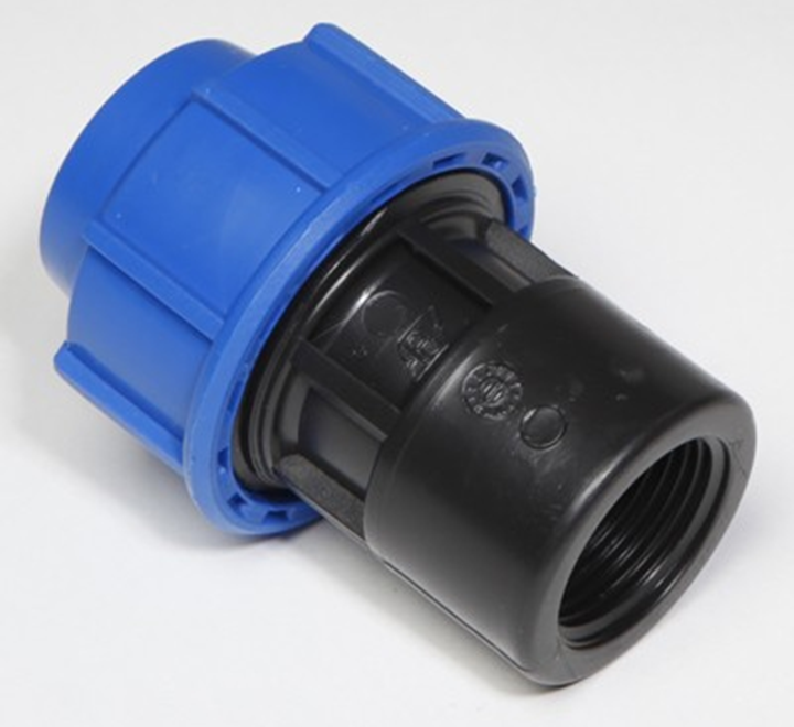PP poluspojnica sa unutrašnjim navojem, fiting koji se koristi za povezivanje okiten creva (PE cevi) sa elementima koji imaju spoljni navoj (npr. slavine, ventili, metalne cevi).