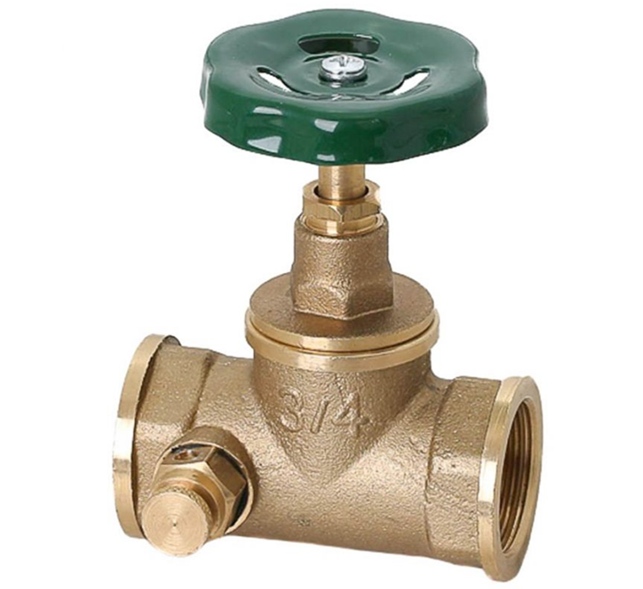 Ravni propusni ventil sa točkićem i ispustom, izrađen od mesinga. Ovaj tip ventila je ključna armatura u vodovodnim instalacijama, a na telu ventila se vidi oznaka 3/4 koja označava promer priključka u inčima.
